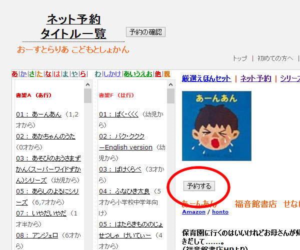 まずは、[ネット予約 タイトル一覧]ページからお好きなタイトルを探します。 それぞれの本のページにある[予約する]ボタンをクリックします。 |