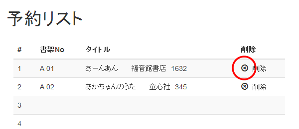 予約リストページでは、今回[予約する]ボタンをクリックした本が表示されていますので、確認してください。 その際、予約を取りやめたい本がありましたら、タイトル横の【削除マーク】をクリックするとリストから削除できます。 |